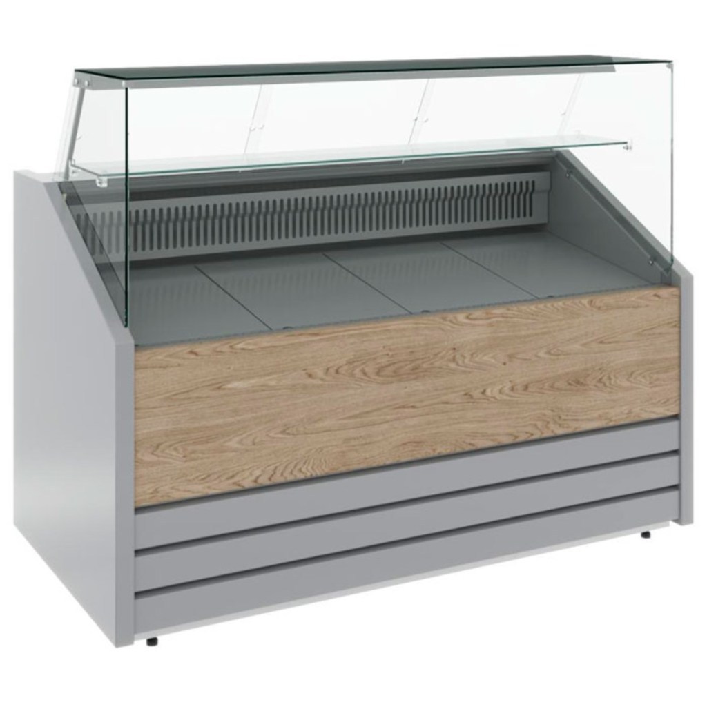 Конструкция витрины включает накопитель для продуктов, поддон для выкладки и регулируемые ножки высотой 20–35 мм. Столешница, зона выкладки, боковые и нижняя фронтальная панели, а также обшивка светильника и испарителя выполнены из стали серебристого цвета. Декоративная передняя панель — из стали, держатель стекла — из нержавеющей стали. Боковины и столешница имеют пенополиуретановую теплоизоляцию.