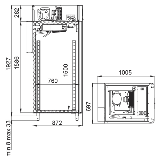 Каталог оборудования Холодильное оборудованиеШкафы холодильныеСпециализированные холодильные шкафыШкаф холодильный для вызревания салями Polair CS107 Salami со стеклом Шкаф холодильный для вызревания салями Polair CS107 Salami со стеклом Код товара: 062-631 Поделиться: WhatsAppTelegram СравнитьДобавить в КПВ избранное 0 385 050 ₽ В корзину 0 шт Под заказСамовывоз сегодня бесплатно Взять в кредит Купить в лизинг Получить консультацию в WhatsApp Описание Характеристики Отзывы 0 Инструкции 5 Шкаф холодильный для вызревания салями Polair CS107 Salami со стеклом предназначен для приготовления и хранения салями, сыровяленых колбас и других мясных деликатесов на предприятиях общественного питания и торговли. Корпус цельнозаливной конструкции выполнен из нержавеющей стали снаружи и внутри (кроме задней стенки), что обеспечивает высокую прочность и долговечность. Дверь выполнена в виде стеклопакета для удобного визуального контроля. Оборудование рассчитано на работу при температуре окружающей среды до +40 °С. Особенности: Динамическое охлаждение с мягким обдувом без заветривания Верхнее расположение агрегата Автоматическая оттайка с системой испарения конденсата Русифицированная многофункциональная панель управления с дисплеем 5" и возможностью создания и сохранения собственных программ Встроенный ультразвуковой увлажнитель (необходима подача очищенной воды и подключение к канализации) UV-лампа для обеззараживания воздуха внутри камеры 3 пары направляющих с тремя перекладинами и подвесами для колбас Регулируемый уровень влажности: от 60 до 95 % Распашная дверь с заливной теплоизоляцией, встроенной ручкой и магнитным уплотнителем Отключаемая внутренняя LED-подсветка Штампованное углубление в дне корпуса для удобства ухода Педаль для удобного открытия двери Хладагент R290 (пропан) Толщина стенки корпуса: 43 мм Polair CS107 Salami со стеклом — это профессиональный шкаф, разработанный специально для мясных деликатесов. Он обеспечивает оптимальные условия для ферментации и хранения продукции за счёт точного контроля температуры и влажности, продуманной конструкции и удобного функционала. Такой шкаф станет надёжным решением для мясных цехов, гастробаров и специализированных магазинов.Изображение товара, представленного на фото, может отличаться от его фактического вида. Показать все Габаритные размеры697×1005×1960 ммДиапазон рабочей температурыот -2 до +30 °CДлина697 ммШирина1005 ммВысота1960 ммОбъём700 лКол-во дверей1 Тип двериСтеклянная Уровень влажностиот 60 до 95 %Холодильный агрегатВстроенный Тип оттайкиАвтоматическая Тип охлажденияДинамическое ПодсветкаЕсть UV-лампаЕсть ХладагентR290 Вес нетто160 кгВес брутто190 кгБрендPolairВсе специализированные холодильные шкафы Из нержавейкиВсе специализированные холодильные шкафы Стеклянная дверь Оставить отзыв Еще никто не оставил отзыв на этот товар Схема POLAIR CS107 Salami.jpgИнструкция на POLAIR CS107 Salami.pdfБрошюра на POLAIR CS107 Salami.pdfДекларация о соответствии.pdfСертификат соответствия.pdf Похожие товары Перейти в каталог Под заказ 405 450 ₽ Шкаф холодильный для хлебопекарных производств Polair CS107 Bakery Br черный, со стеклом (Тип 1) Под заказ 389 300 ₽ Шкаф холодильный для вызревания сыра Polair CS107 Cheese черный, со стеклом Под заказ 392 700 ₽ Шкаф холодильный для вызревания мяса Polair CS107 Meat черный, со стеклом (Тип 2) Под заказ 419 900 ₽ Шкаф холодильный для хлебопекарных прои