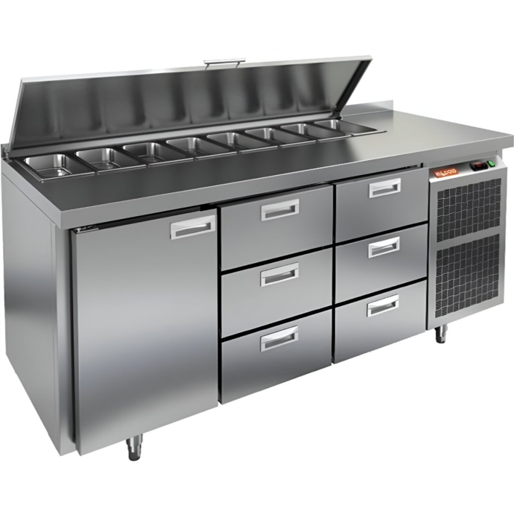 Каталог оборудования Холодильное оборудованиеСтолы охлаждаемыеСтолы холодильные для салатовСтол холодильный для салатов HiCold SL1-133GN (1/3) с крышкой Стол холодильный для салатов HiCold SL1-133GN (1/3) с крышкой Код товара: 064-848 Поделиться: WhatsAppTelegram СравнитьДобавить в КПВ избранное 0 209 962 ₽ В корзину 0 шт Под заказСамовывоз сегодня бесплатно Взять в кредит Купить в лизинг Получить консультацию в WhatsApp Описание Характеристики Отзывы 0 Стол холодильный для салатов HiCold SL1-133GN (1/3) предназначен для использования на предприятиях общественного питания и торговли. Он объединяет рабочую поверхность и охлаждаемый отсек, что делает его удобным решением для хранения, охлаждения и подготовки ингредиентов при приготовлении салатов, пиццы и других блюд. Такая конструкция позволяет повару работать быстрее и эффективнее, так как все необходимые продукты находятся под рукой. Корпус и столешница выполнены из прочной нержавеющей стали, устойчивой к коррозии и легко поддающейся санитарной обработке. Металлическая крышка защищает продукты от загрязнений и сохраняет их свежесть. Особенности модели: Электронная панель управления — точная настройка температурного режима. 1 глухая дверь — удобный доступ к холодильному отсеку. 6 выдвижных ящика — быстрое размещение и замена продуктов. Вместимость салат-бара — до 8 гастроемкостей глубиной до 100 мм. Автоматические доводчики дверей с фиксацией в открытом положении. Легкозаменяемые магнитные уплотнители — надежная герметичность. Открытая агрегатная часть — быстрый доступ для обслуживания. Регулируемые по высоте ножки — устойчивость даже на неровном полу. Толщина столешницы, борта и теплоизоляции — 50 мм, что обеспечивает прочность и энергоэффективность конструкции. HiCold SL1-133GN (1/3) — практичное и удобное решение для профессиональной кухни, обеспечивающее удобную подготовку и хранение ингредиентов. Изображение товара, представленного на фото, может отличаться от его фактического вида. Показать все Габаритные размеры1835×700×850 ммДиапазон рабочей температурыот +2 до +10 °CРасположение агрегатаБоковое Материал столешницыНержавеющая Тип столаС дверьми и ящиками Тип двериГлухая Объём505 лКоличество дверей1 штТип гастроемкостейGN 1/3 Количество ящиков6 штРазмер полки530×325 ммНапряжение220 ВМощность0,46 кВтТип охлажденияДинамическое Тип оттайкиАвтоматическая СтолешницаС бортом Габариты в упаковке2000×850×1000 ммВес нетто130 кгВес брутто185 кгБрендHicold Оставить отзыв Еще никто не оставил отзыв на этот товар Ранее просмотрено Под заказ 143 721 ₽ Стол холодильный для салатов HiCold SL1-11GN (1/3) О с крышкой