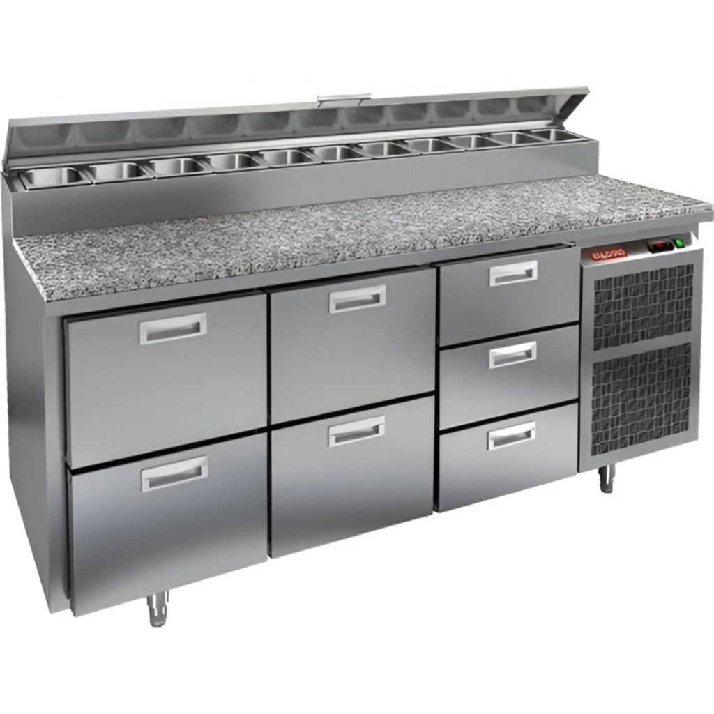 Стол холодильный для пиццы HiCold PZ2-223GN (1/6) камень предназначен для профессиональных кухонь и предприятий общественного питания. Он используется для раскатки теста, подготовки ингредиентов для пиццы, салатов и других блюд, а также для охлаждения и кратковременного хранения скоропортящихся продуктов. Модель совмещает гранитную рабочую поверхность и охлаждаемый отсек с 7 выдвижными ящиками, что обеспечивает максимальное удобство доступа к ингредиентам и эффективное распределение хранения.