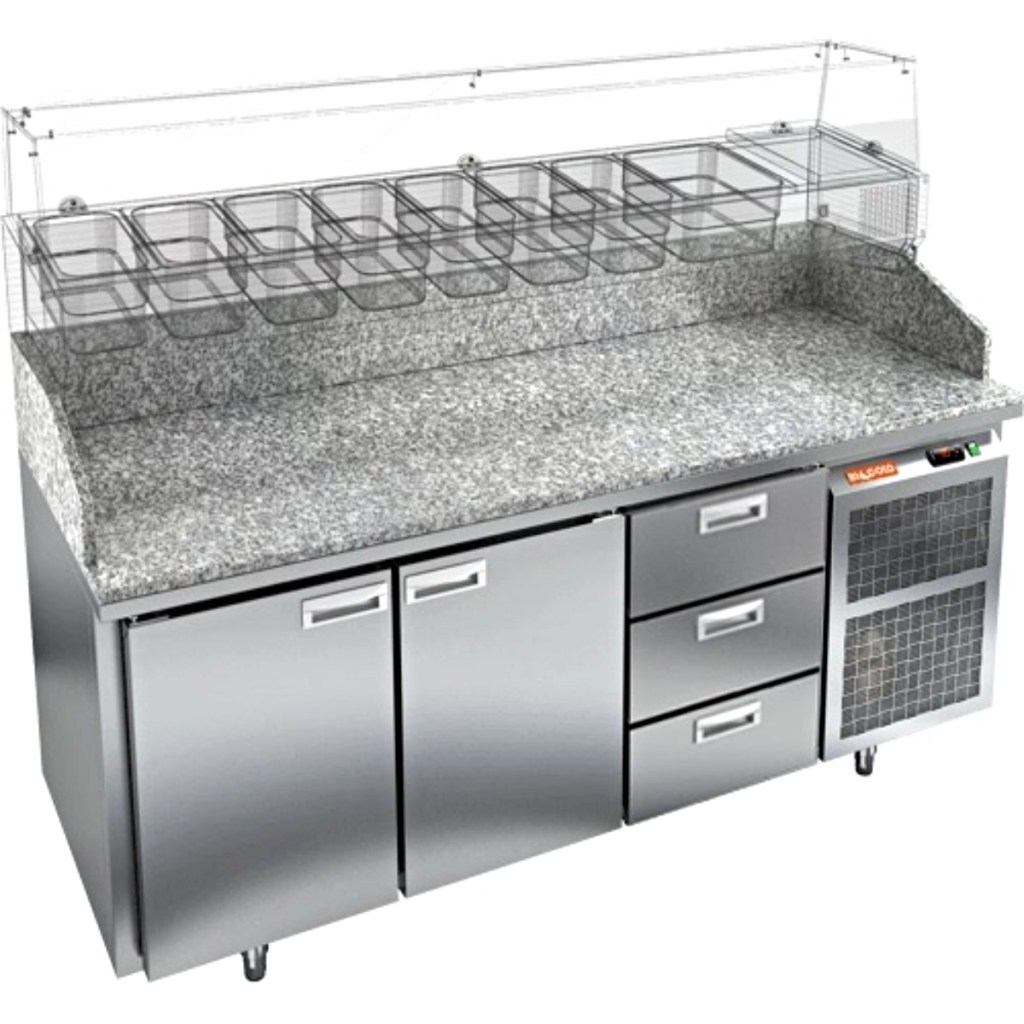 Каталог оборудования Холодильное оборудованиеСтолы охлаждаемыеСтолы холодильные для пиццыСтол холодильный для пиццы HiCold PZ3-113/GN камень Стол холодильный для пиццы HiCold PZ3-113/GN камень Код товара: 065-007 Поделиться: WhatsAppTelegram СравнитьДобавить в КПВ избранное 0 312 652 ₽ В корзину 0 шт Под заказСамовывоз сегодня бесплатно Взять в кредит Купить в лизинг Получить консультацию в WhatsApp Описание Характеристики Отзывы 0 Стол холодильный для пиццы HiCold PZE3-113/GN камень предназначен для использования в пиццериях, кафе, магазинах и ресторанах. Он идеально подходит для раскатки теста, подготовки ингредиентов и кратковременного хранения скоропортящихся продуктов. Витрина приобретается отдельно. Стол сочетает корпус из нержавеющей стали и гранитную столешницу, которая устойчива к механическим и температурным нагрузкам и удобна в работе с тестом. Такая конструкция обеспечивает долговечность, гигиеничность и простоту ухода. Особенности модели: Охлаждение: динамическое — равномерное поддержание температуры Оттайка: автоматическая — удобство и экономия времени Панель управления: электронная — точная настройка температуры Ножки: регулируемые по высоте — устойчивость на неровной поверхности Двери: 2 глухие двери с автоматическими доводчиками и фиксатором открытого положения Ящики: 3 выдвижных ящика — удобное хранение ингредиентов Уплотнители: легкозаменяемые магнитные — герметичность и простота обслуживания Толщина теплоизоляции: 50 мм — сохранение холода и энергоэффективность Рабочая поверхность: глубина 680 мм — удобство работы HiCold PZE3-113/GN камень— это надёжный и функциональный холодильный стол для пиццы, который сочетает прочность, эргономику и эффективное охлаждение. Благодаря гранитной столешнице, корпусу из нержавеющей стали, двум глухим дверям и двум выдвижным ящикам он станет универсальным решением для профессиональной кухни. Изображение товара, представленного на фото, может отличаться от его фактического вида. Показать все Габаритные размеры1835×700×1050 ммДиапазон рабочей температурыот +2 до +10 °CРасположение агрегатаБоковое Материал столешницыГранитная Тип столаС дверьми и ящиками Тип двериГлухая Объём505 лКоличество дверей2 штКоличество ящиков3 штРазмер полки530×325 ммНапряжение220 ВМощность0,5 кВтТип охлажденияДинамическое Тип оттайкиАвтоматическая Габариты в упаковке2000×850×1180 ммВес нетто172 кгВес брутто192 кгБрендHicoldВсе холодильные столы для пиццы HicoldВсе нержавеющие холодильные столы для пиццы Оставить отзыв Еще никто не оставил отзыв на этот товар Ранее просмотрено Под заказ 358 552 ₽ Стол холодильный для пиццы HiCold PZ3-133/GN камень
