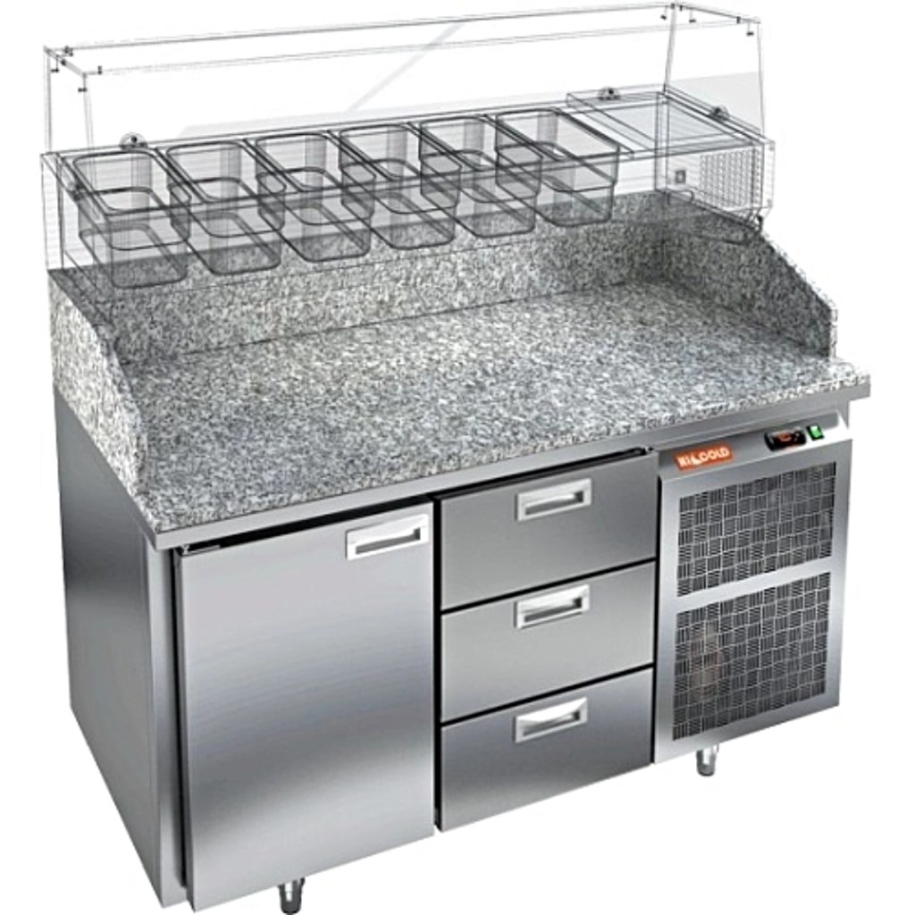 Стол холодильный для пиццы HiCold PZ3-13/GN камень предназначен для использования на предприятиях общественного питания и торговли. Он сочетает удобную гранитную рабочую поверхность и охлаждаемый объём для кратковременного хранения скоропортящихся продуктов и ингредиентов для приготовления пиццы, салатов и других блюд. Такая конструкция облегчает работу повара, обеспечивая быстрый доступ ко всем необходимым компонентам.