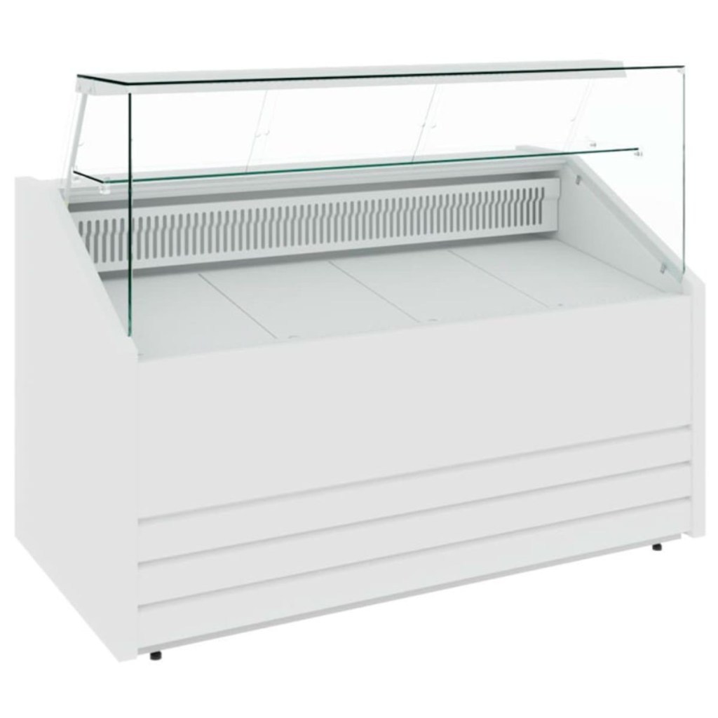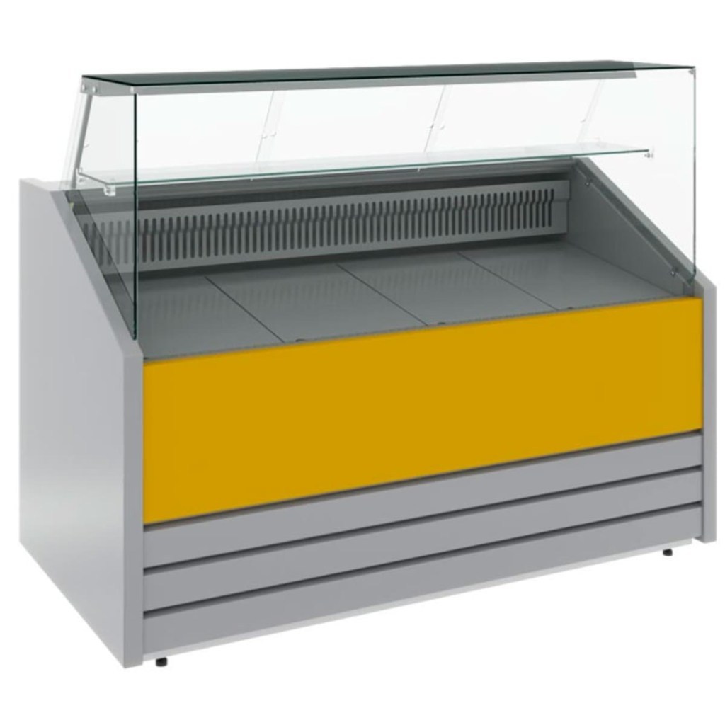Конструкция витрины включает накопитель для продуктов, поддон для выкладки и регулируемые ножки высотой 20–35 мм. Столешница, зона выкладки, боковые и нижняя фронтальная панели, а также обшивка светильника и испарителя выполнены из стали серебристого цвета.Декоративная передняя панель — из стали, держатель стекла — из нержавеющей стали. Боковины и столешница имеют пенополиуретановую теплоизоляцию.