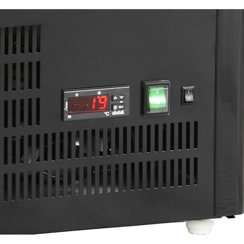 Витрина оснащена стеклянной дверью, LED-подсветкой, 2 регулируемыми полками и градусником, что облегчает контроль температуры и обеспечивает привлекательную демонстрацию продукции. Внешняя и внутренняя обшивка выполнена из ABS-пластика, что гарантирует долговечность и лёгкий уход.